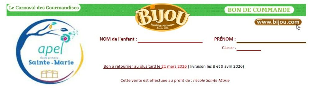 Afin de soutenir les projets de l’école, l’APEL organise une vente de Gâteaux Bijou. Les bons de commande et le catalogue du carnaval des saveurs seront distribués vendredi dans les cartables.