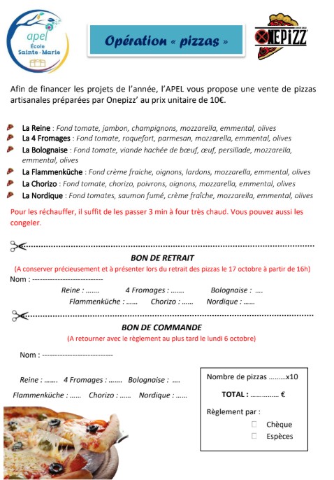 L’APEL organise pour le vendredi 17 octobre une vente de pizzas. Le bon de commande ci-dessous a été distribué dans les cartables ou le sera en début de semaine prochaine.
