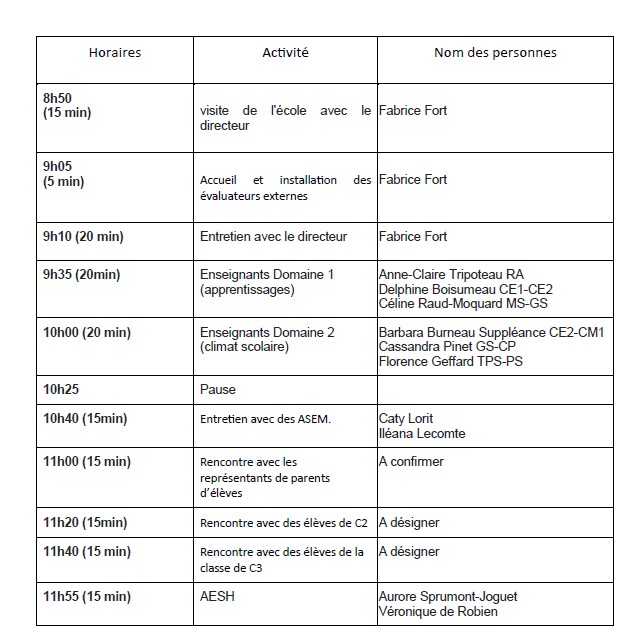 Lors de la visite de Mme Bournoville, Inspectrice de l’Education Nationale et de M. Blanchard, chef d’établissement d’une école privée du Maine-et-Loire, les temps d’échange entre les évaluateurs et les membres de l’école (adultes comme élèves) vont perturber l’organisation des classes. Des membres de l’APEL vont devoir surveiller les enfants pendant les temps d’absence des enseignants.