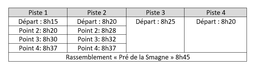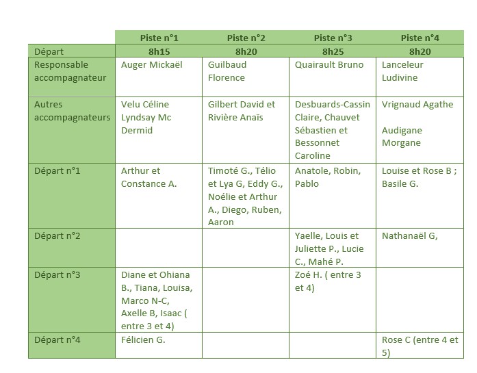 Pour l’instant 28 élèves sont inscrits sur les 4 pistes. Pour les départs, nous pensons les prévoir vers 8h ( selon l’âge des enfants et leur rythme de marche).